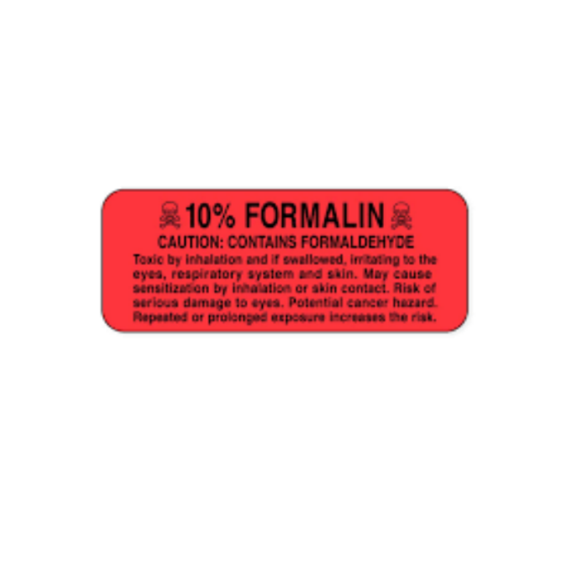 Because labeling practices vary by facility, this label is intended to complement established protocols for specimen identification, chemical awareness, and chain-of-custody procedures. It can be used as an attention label alongside primary patient and specimen identifiers, or as part of a broader color-coding program for fixatives and hazardous reagents. The wording “10% Formalin” provides immediate recognition for personnel who may encounter the container at different points in the workflow, including couriers, receiving staff, histology, and waste management teams.